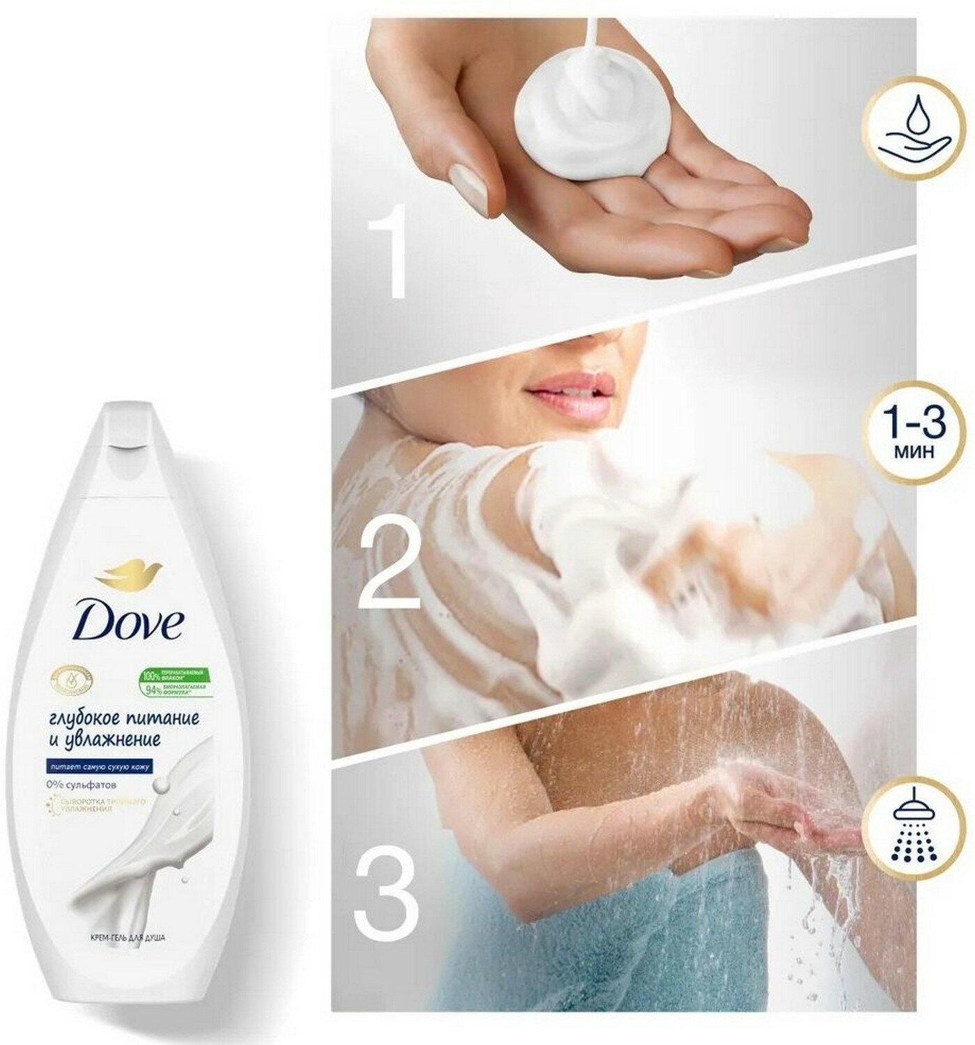 Dove бессульфатный крем-гель для душа Глубокое питание и увлажнение 250 мл - 3 шт