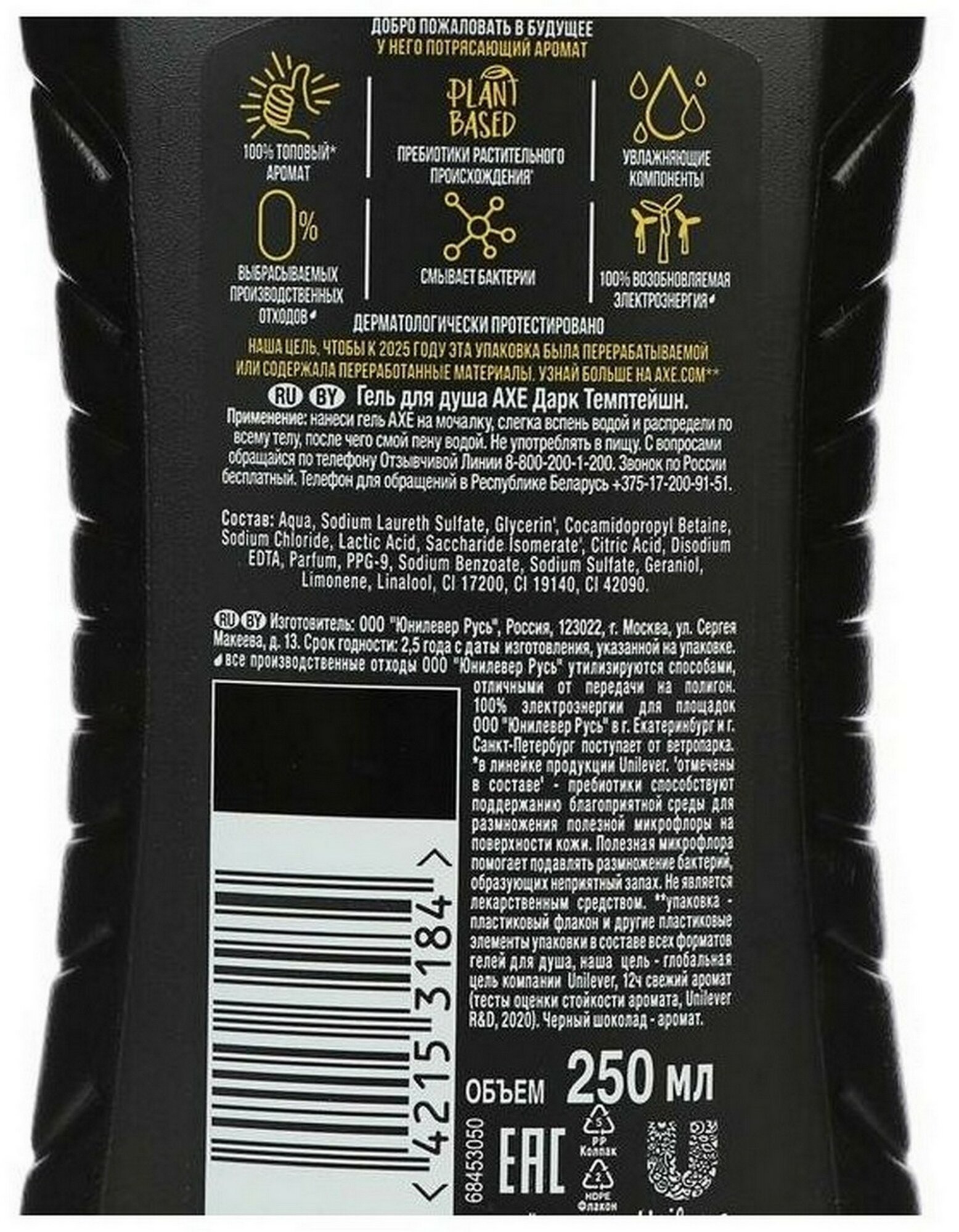 | Способ применения | нанеси гель AXE на мочалку, слегка вспень водой и распредели по всему телу, после чего смой пену водой. Можешь использовать его как шампунь. Избегай попадания в глаза, при попадании тщательно промой их водой |