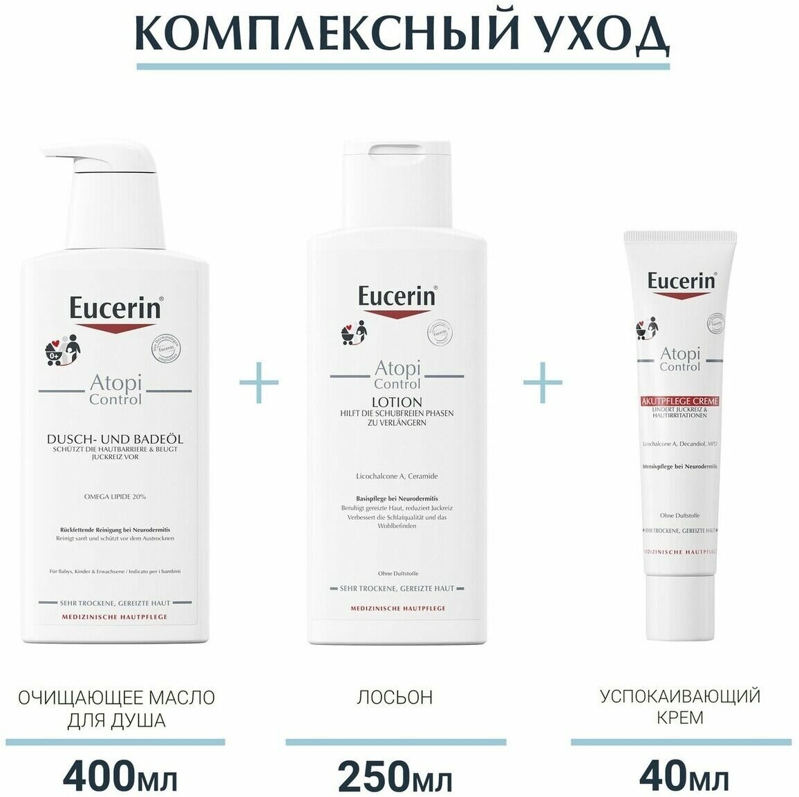 | Способ применения | нанесите очищающее масло для атопической кожи Eucerin AtopiControl на влажную кожу. Деликатно помассируйте до образования пены и тщательно смойте водой. Осторожно промокните кожу полотенцем. Использовать для детей только в качестве добавки в ванну |