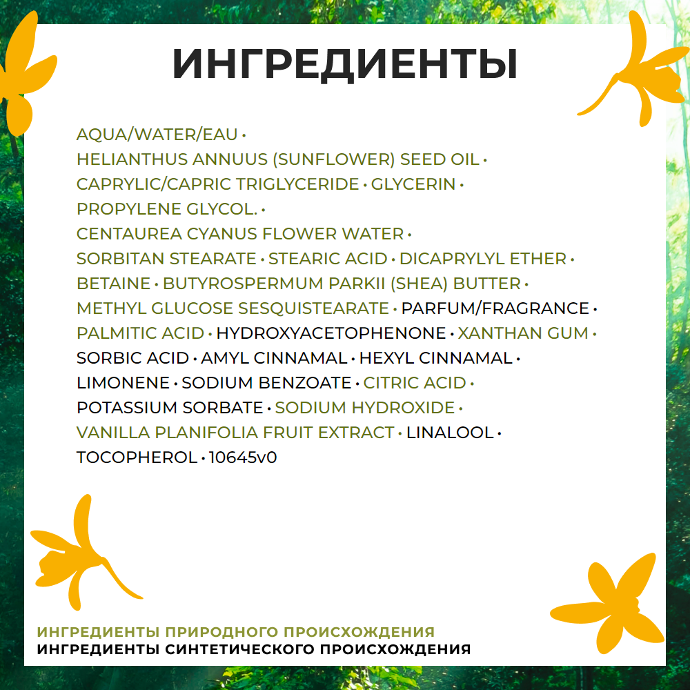 | Состав | AQUA/WATER/EAUHELIANTHUS ANNUUS (SUNFLOWER) SEED OILCAPRYLIC/CAPRIC TRIGLYCERIDEGLYCERINPROPYLENE GLYCOL.CENTAUREA CYANUS FLOWER WATERSORBITAN STEARATESTEARIC ACIDDICAPRYLYL ETHERBETAINEBUTYROSPERMUM PARKII (SHEA) BUTTERMETHYL GLUCOSE SESQUISTEARATEPALMITIC ACIDHYDROXYACETOPHENONEPARFUM/FRAGRANCEXANTHAN GUMSORBIC ACIDLIMONENESODIUM BENZOATERUBUS IDAEUS (RASPBERRY) FRUIT EXTRACTCITRIC ACIDPOTASSIUM SORBATESODIUM HYDROXIDETOCOPHEROL10647v0 |