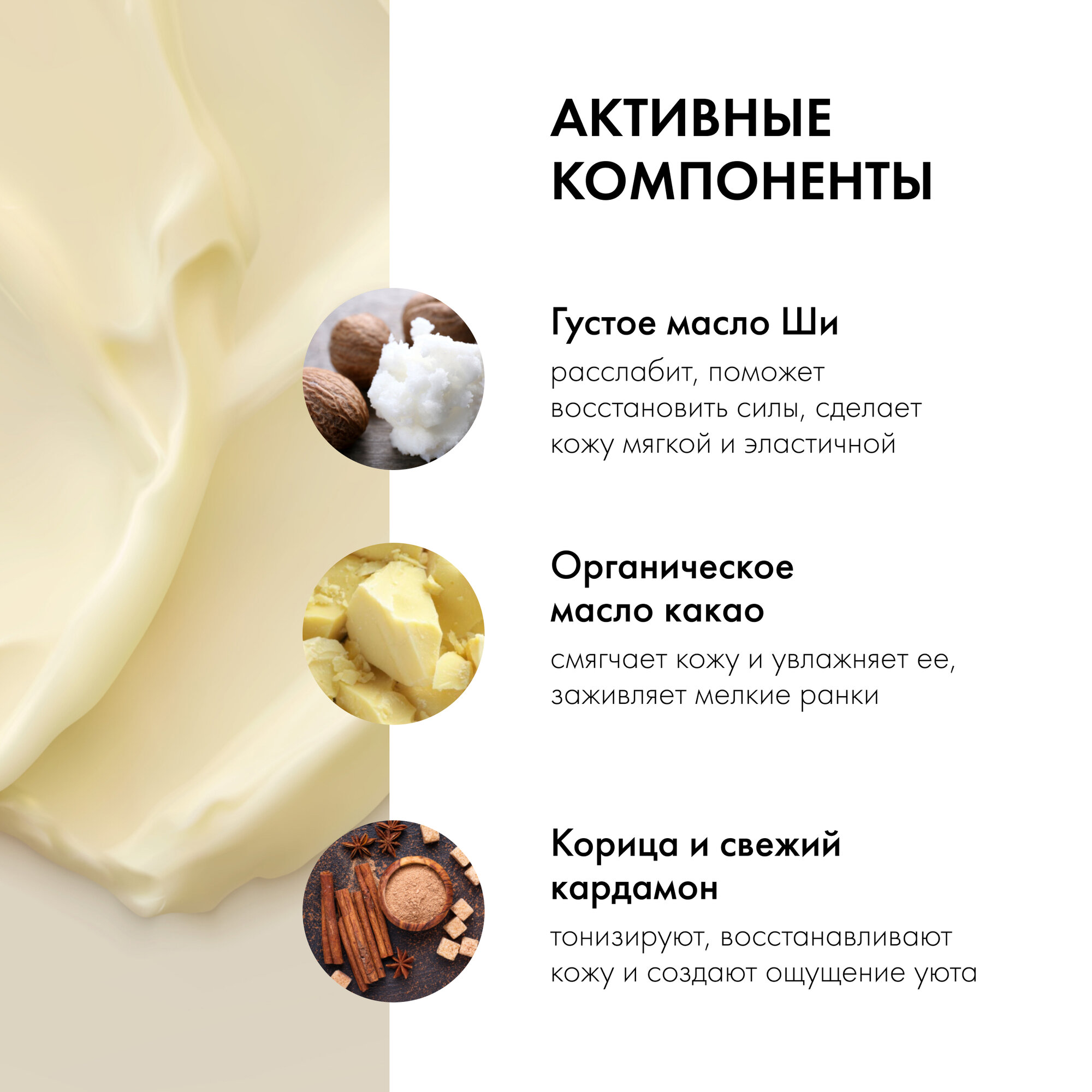 | Состав | Aqua, Butyrospermum Parkii (Shea) Butter, Organic Theobroma Cacao Seed Butter, Glycerin, Cetearyl Alcohol, Glyceryl Stearate, Cinnamomum Zeylanicum Bark Oil, Elettaria Cardamomum Seed Oil, Santalum Album Wood Oil, Benzoic Acid, Sorbic Acid, Sodium Hydroxide, Parfum, Beta-Carotene. |