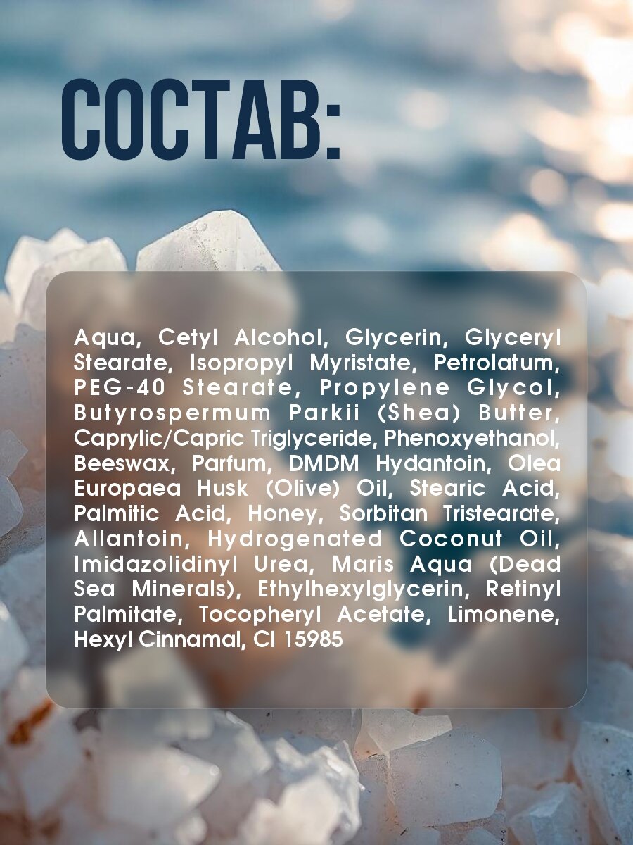 | Состав | Aqua, Cetyl Alcohol, Glycerin, Glyceryl Stearate, Isopropyl Myristate, Petrolatum, PEG-40 Stearate, Propylene Glycol, Butyrospermum Parkii (Shea) Butter, Caprylic/Capric Triglyceride, Phenoxyethanol, Beeswax, Parfum, DMDM Hydantoin, Olea Europaea Husk (Olive) Oil, Stearic Acid, Palmitic Acid, Honey, Sorbitan Tristearate, Allantoin, Hydrogenated Coconut Oil, Imidazolidinyl Urea, Maris Aqua (Dead Sea Minerals), Ethylhexylglycerin, Retinyl Palmitate, Tocopheryl Acetate, Limonene, Hexyl Cinnamal, CI 15985 |
