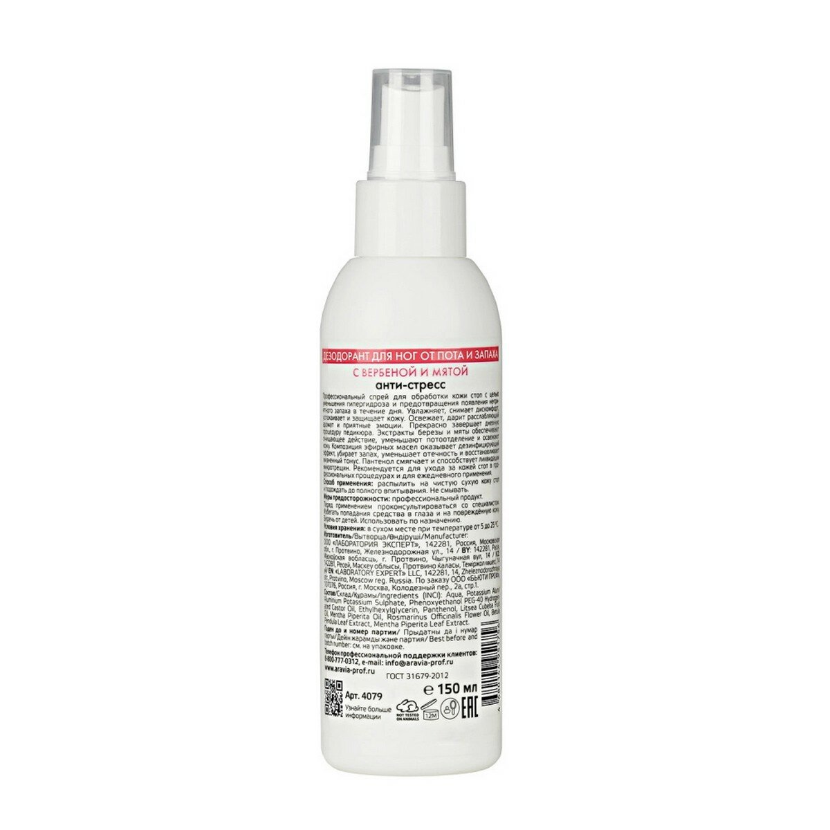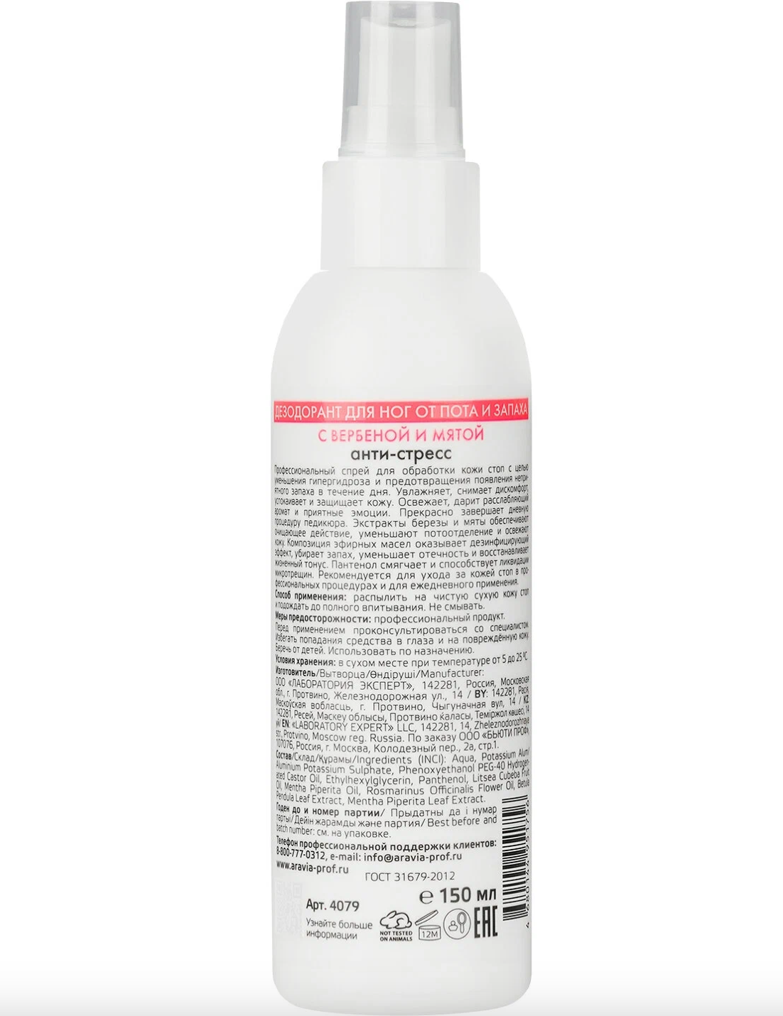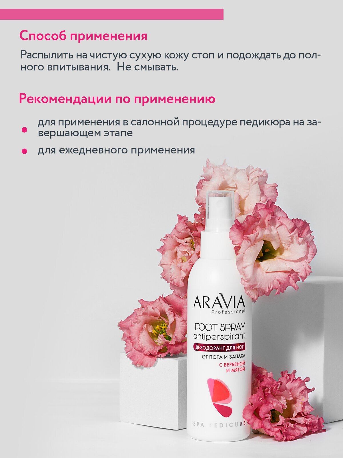 | Способ применения | распылить на чистую сухую кожу стоп и подождать до полного впитывания. Не смывать. |