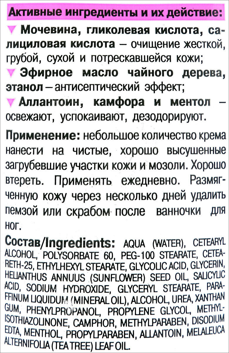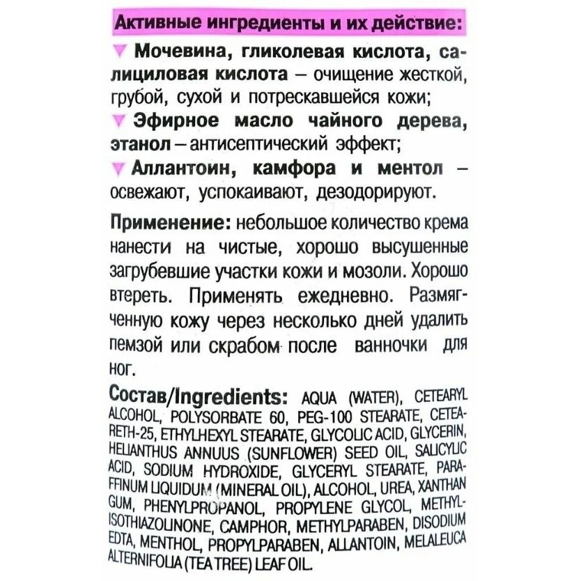 | Способ применения | небольшое количество крема нанести на чистые, хорошо высушенные загрубевшие участки кожи и мозоли. Хорошо втереть. Применять ежедневно. Размягченную кожу через несколько дней удалить пемзой или скрабом после ванночки для ног |