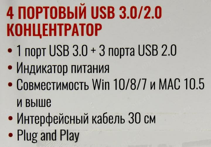 Концентратор 4-х портовый USB 3.0/2.0 Ginzzu GR-339UB, 1 порт USB 3.0 + 3 порта USB 2.0, интерфейсный кабель USB3.0 - 30 см, упаковка блистер, черный
