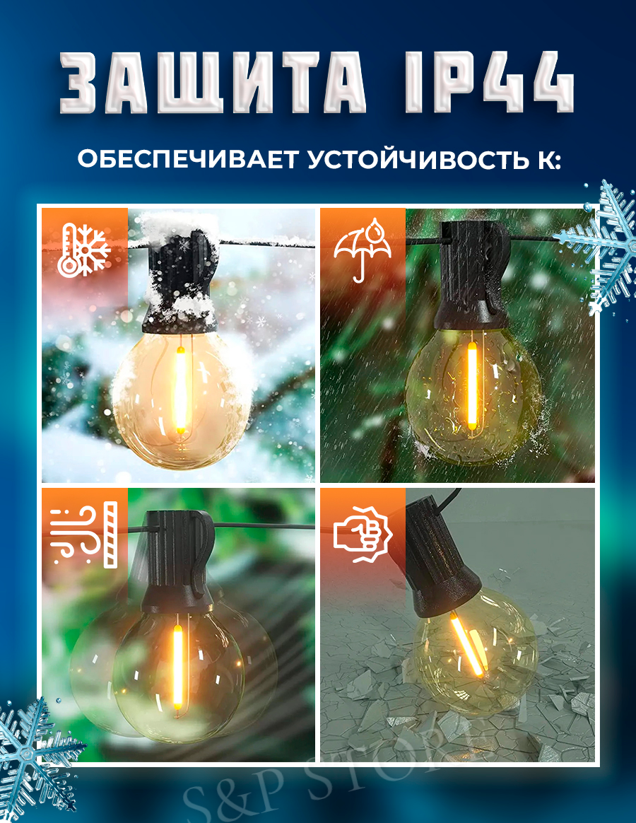 LED электрогирлянда уличная, Ретро - лампочки накаливания 50 ламп, 15 м, iP 44, новогодняя, садовая, морозостойкая, Белт лайт интересное: