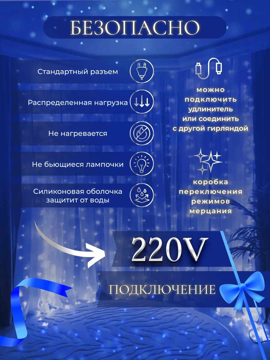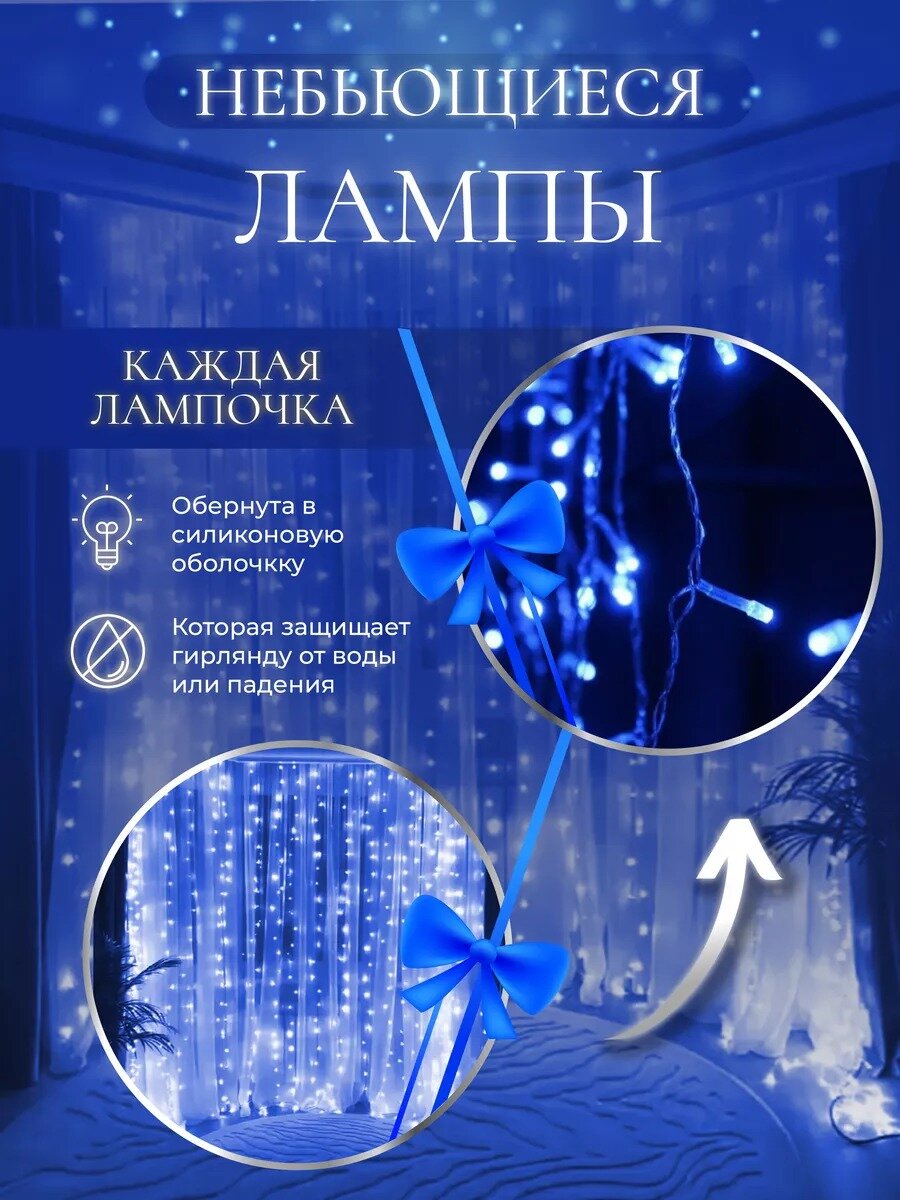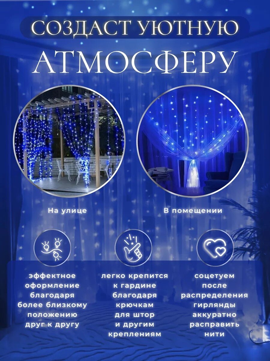 Гирлянда электрическая светодиодная 3х3 метра, синяя/ Гирлянда штора занавес новогодняя разноцветный