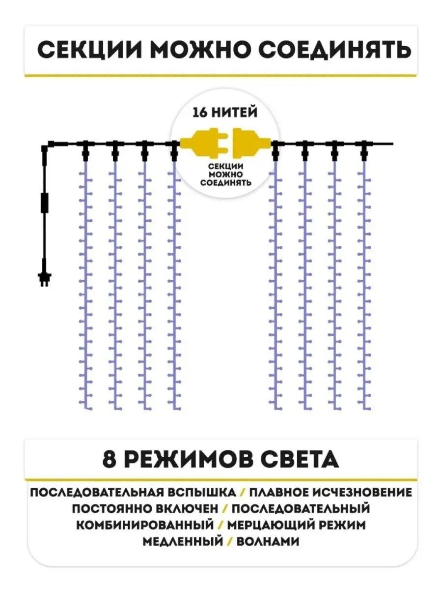 | Комплектация | упаковка 1 шт.; вилка для питания - 1 шт.; вилка для соединения - 1шт.; гирлянда с блоком управления - 1 шт. |