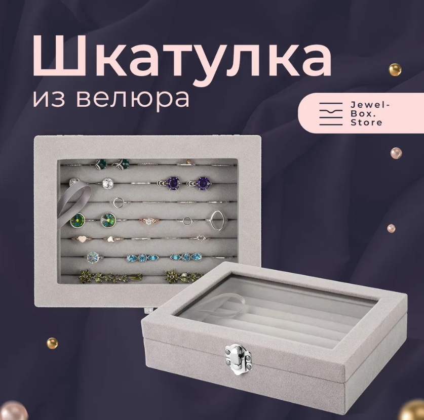Ниже Вы можете прочитать отзывы на Шкатулка для хранения украшений Эмма из велюра для колец, серая с крышкой из стекла, ознакомится с подробными характеристиками, посмотреть интересные обзоры и фотографии на Шкатулка для хранения украшений Эмма из велюра для колец, серая с крышкой из стекла.