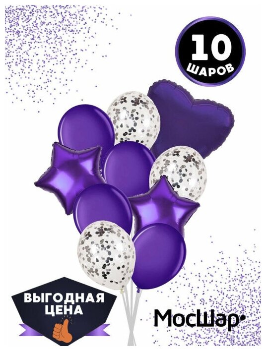 Набор воздушных латексных шаров мосшар, конфетти -10шт, высота 30см, цвет фиолетовый