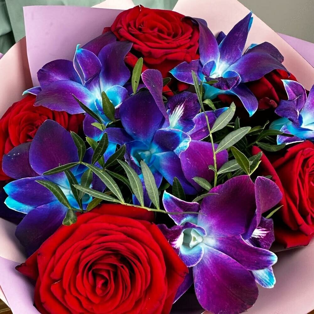 | Состав | Лента атласная - 1 шт. Орхидея дендробиум синяя - 12 шт. Средство для продления жизни цветов - 1 шт. Дизайнерская упаковка - 2 шт. инструкция по уходу за цветами - 1 шт. колбы для орхидея - 6 шт. красные розы - 5 шт. любовь флориста (бесплатно) - 1 шт. |