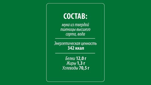 | Состав | мука из твердой пшеницы для макаронных изделий высшего сорта, вода питьевая |