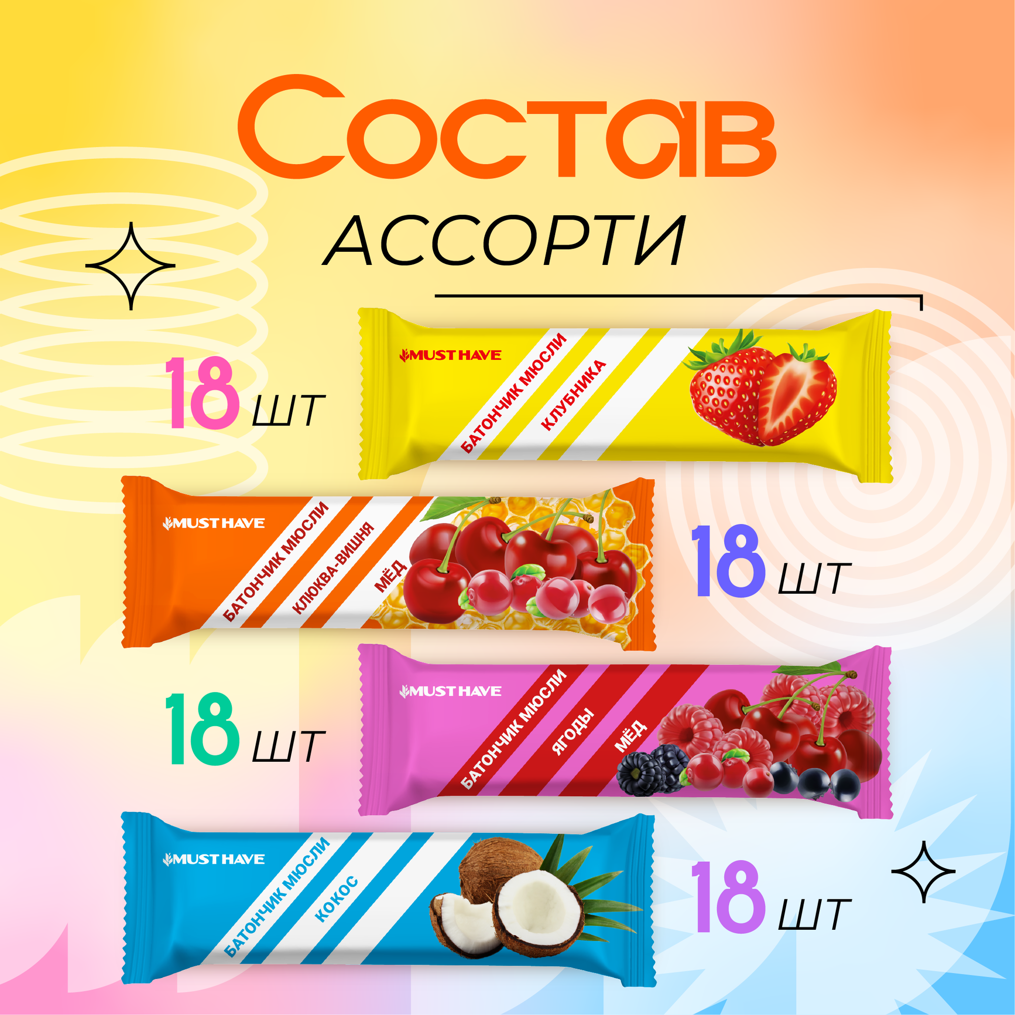 Злаковые батончики MustHave Ассорти 4 вкуса, мюсли, перекус 25г (72шт)