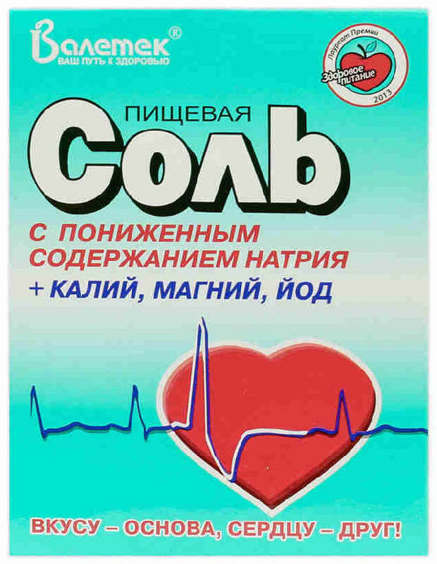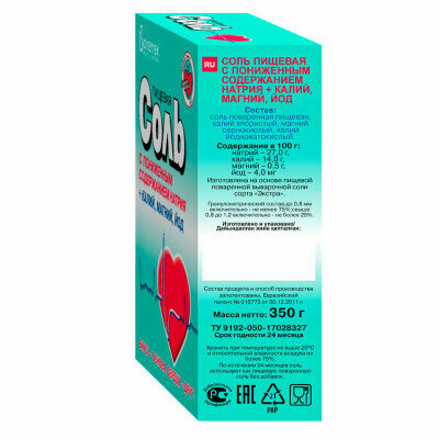 | Дополнительная информация | В соли пищевой с пониженным содержанием натрия + калий, магний, йод 30% хлорида натрия заменены на соли калия и магния. Дополнительно соль обогащена высокостабильным соединением йода. Использование такой соли существенно уменьшает избыточное потребление натрия; обогащает рацион солями калия и магния; полностью обеспечивает организм человека необходимым количеством йода. |