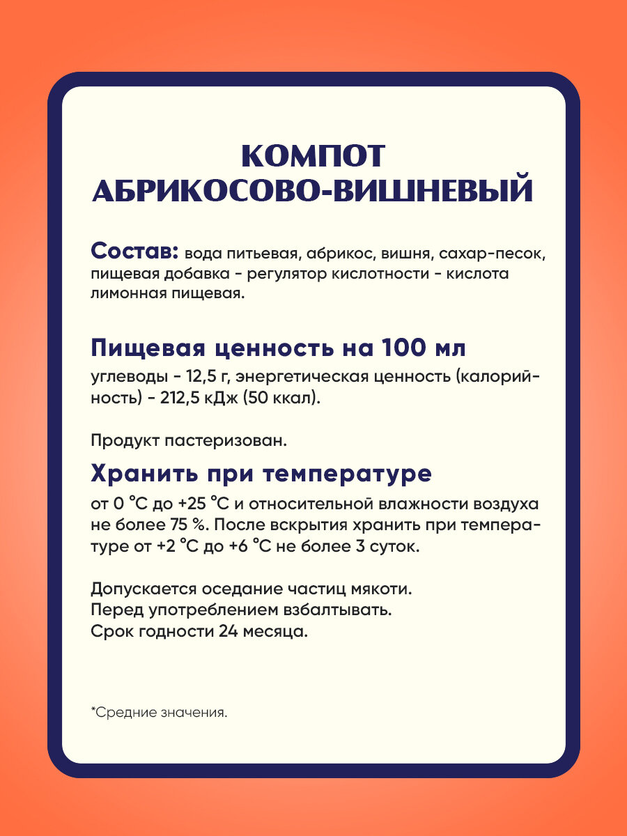 | Состав | Вода питьевая, абрикос, вишня, сахар-песок, пищевая добавка - регулятор кислотности - кислота лимонная пищевая. |