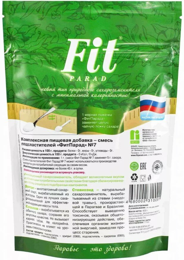 Ниже Вы можете прочитать отзывы на Fit Parad № 7 Смесь подсластителей на основе эритритола Дойпак 100 г, ознакомится с подробными характеристиками, посмотреть интересные обзоры и фотографии на Fit Parad № 7 Смесь подсластителей на основе эритритола Дойпак 100 г.