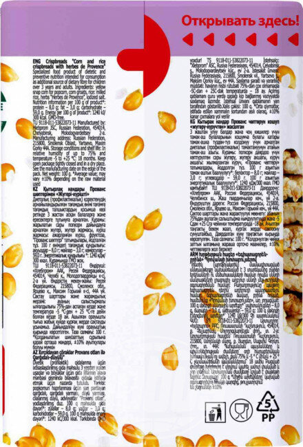 | Состав | кукуруза лопающаяся желтая для приготовления попкорна / крупа рисовая: рис шлифованный / крупа кукурузная / пряности "Прованские травы" / соль йодированная |