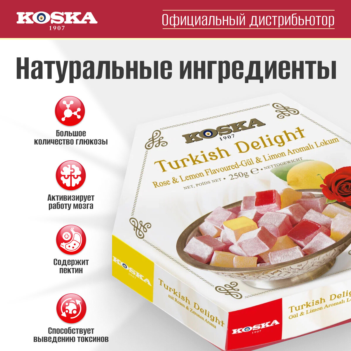 Рахат-лукум с ароматом розы и лимона KOSKA 125 гр, в подарочной, картонной упаковке