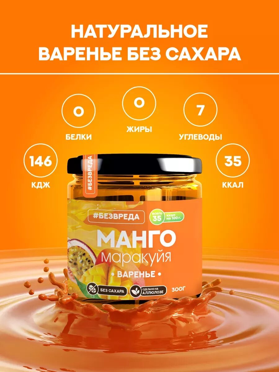 Варенье "Манго и маракуйя" без сахара "безвреда" 300 гр / Варенье со вкусом манго и маракуйя / Варенье без сахара