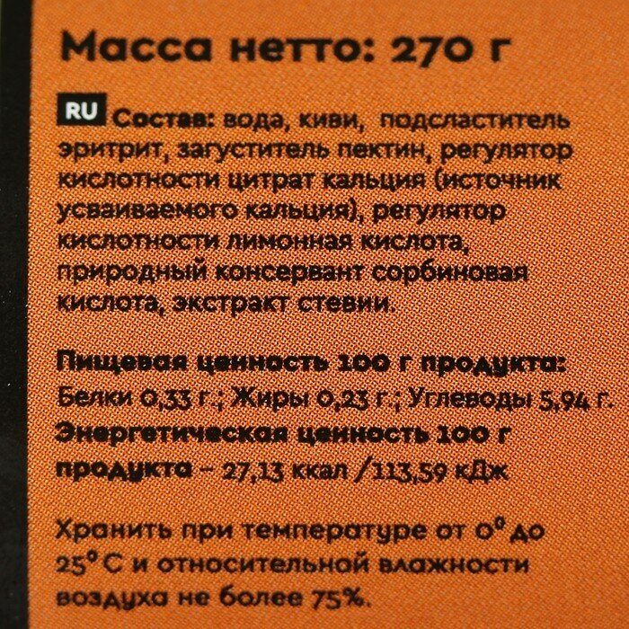 | Состав | вода, абрикос (ананас, вишня, груша, киви, клубника, банан, малина, манго, маракуйя, черника), подсластитель эритрит, загуститель пектин, регулятор кислотности цитрат кальция (источник усваиваемого кальция), регулятор кислотности лимонная кислота, природный консервант сорбиновая кислота, подсластитель экстракт стевии. |