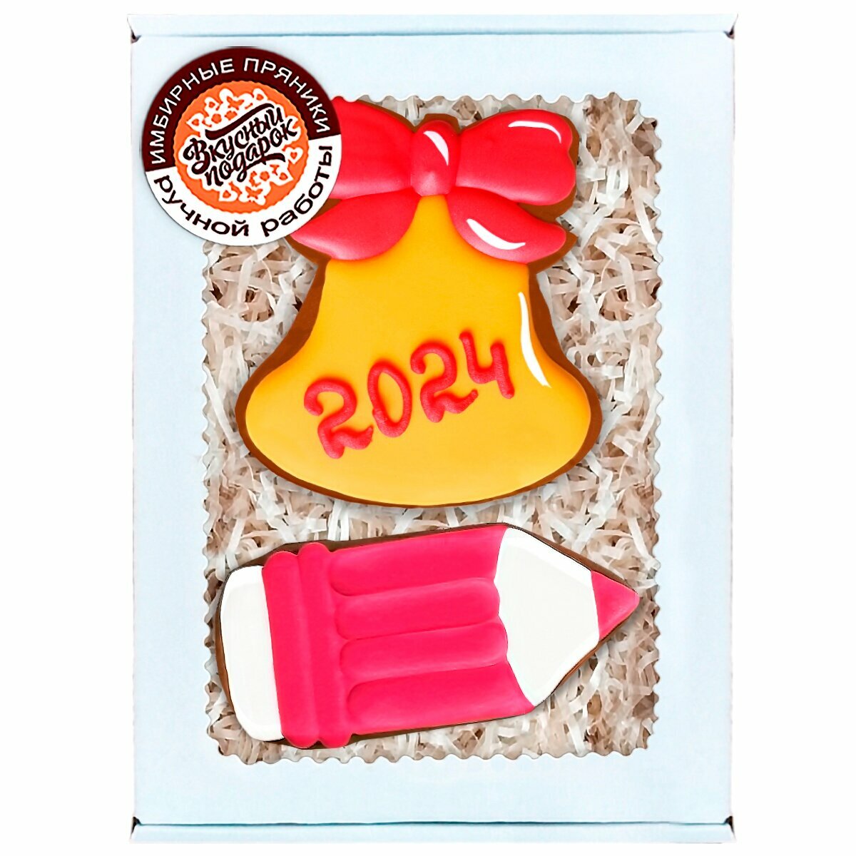 Имбирные пряники ручной работы учителю или выпускнику на Последний звонок или Выпускной в школе "Звонок и бордовый карандаш" 18х12 см