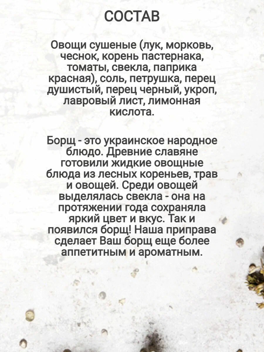 | Состав | овощи сушеные (лук, морковь, чеснок, корень пастернака, томаты, свекла, паприка красная), соль, петрушка, перец душистый, перец черный, укроп, лавровый лист, лимонная кислота. |