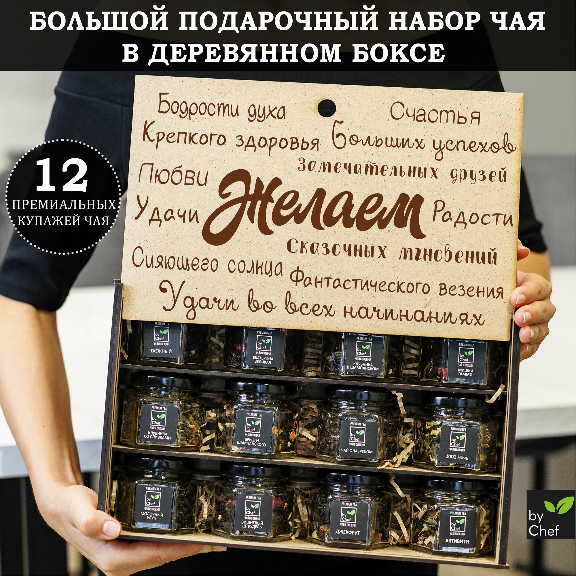 | Состав набора | Чай с чабрецом, Брызги шампанского, Активити, Клубника в шампанском, Екатерина великая, Молочный улун, Вишневый штрудель, 1001 ночь, Мишки гамми, Джекфрут, Клубника со сливками, Таежный |