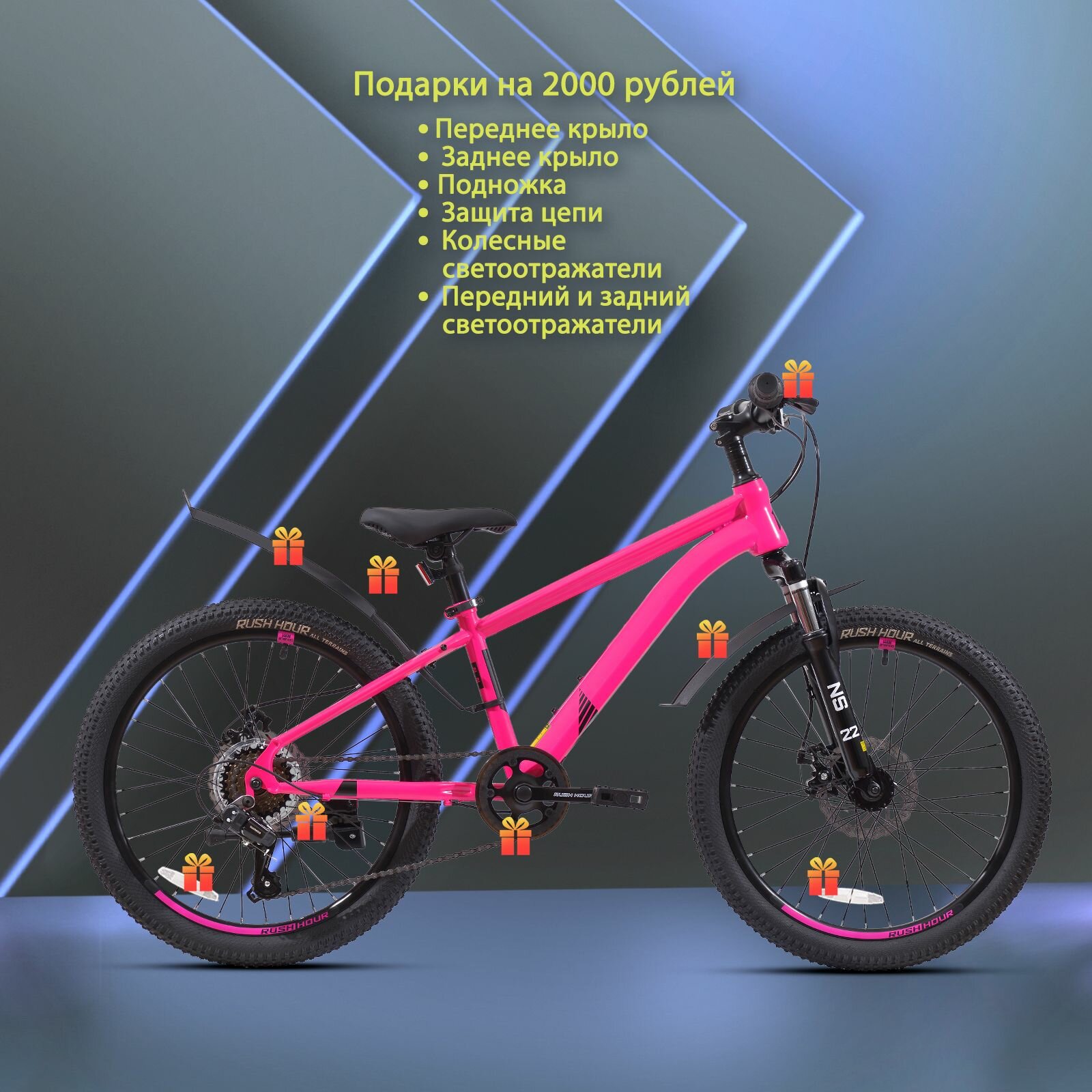 СохранитьВелосипед детский горный дисковый 22" рост 125-140см 6 скоростей розовый рама 12" велик 9 лет 7 лет 8 лет переключатель SHIMANO скоростной RUSH HOUR NX 305 интересное: