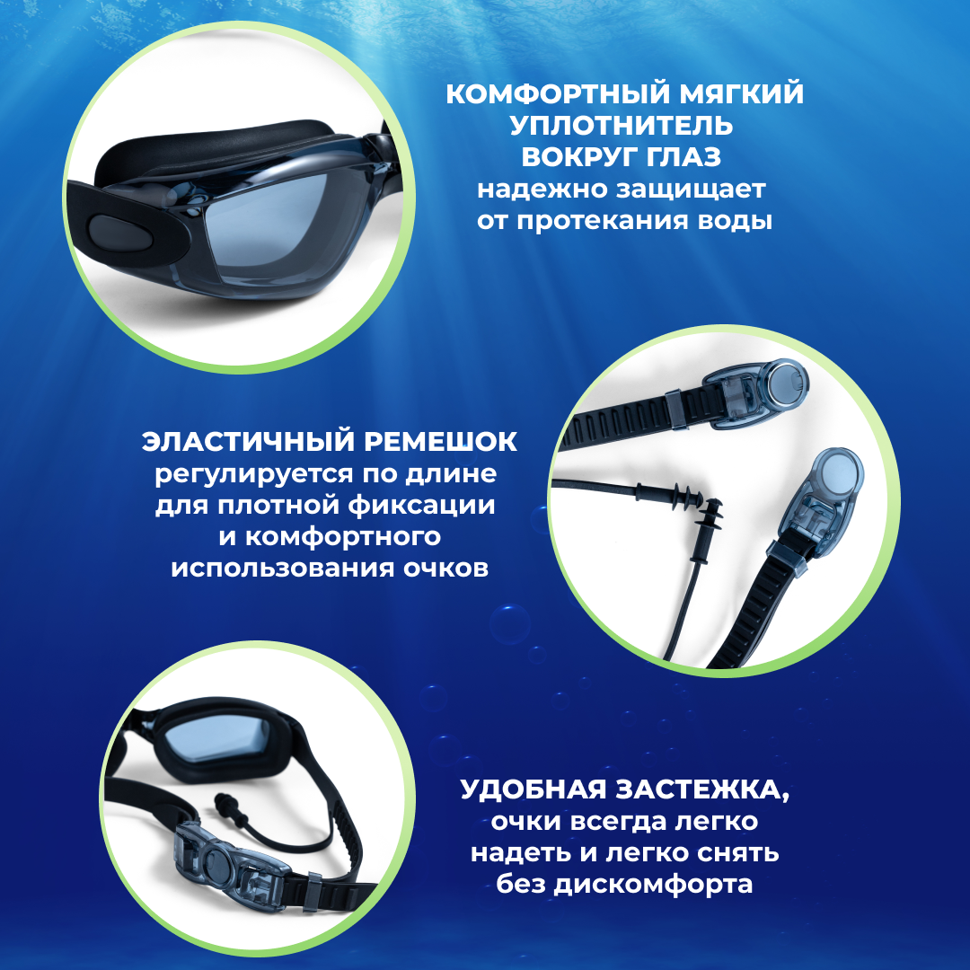 СохранитьОчки для плавания детские, взрослые, женские, мужские / Подводные плавательные очки для бассейна черные / беруши, сумка футляр в комплекте интересное: