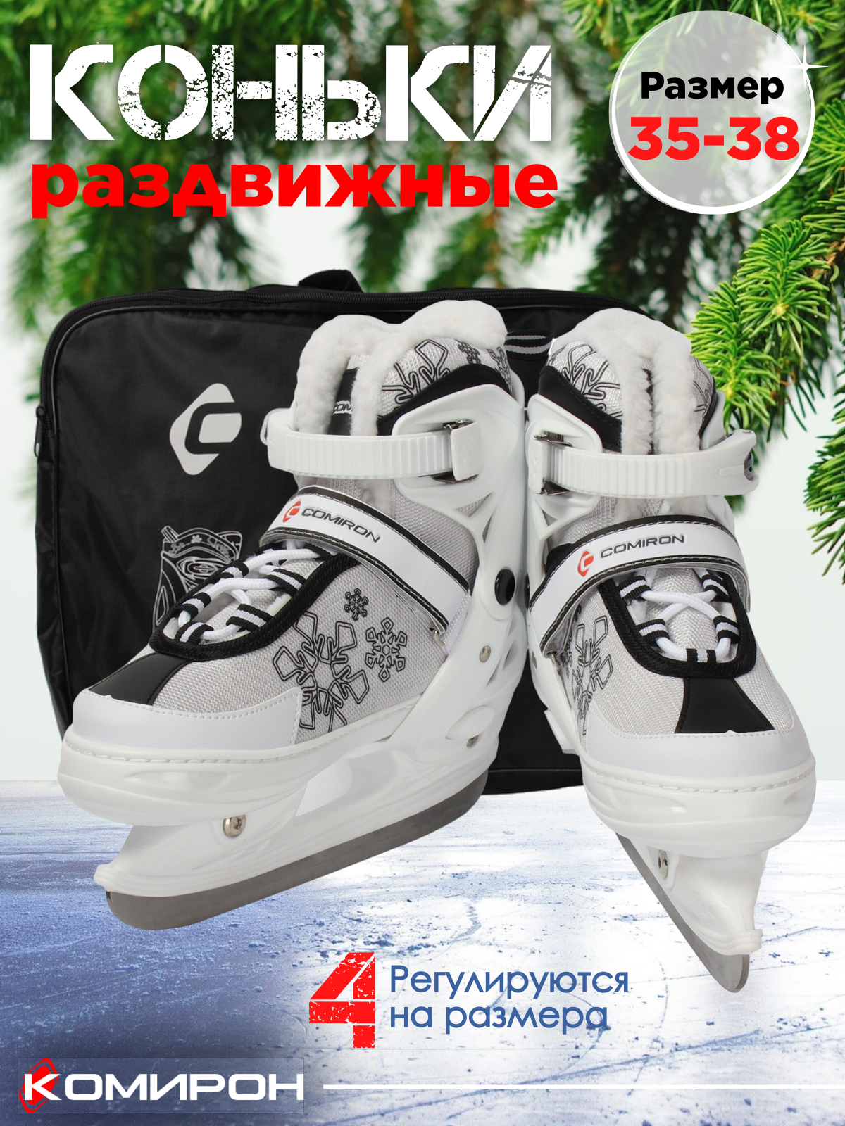 Коньки ледовые раздвижные COMIRON / размер 35-38 / чёрно-белые