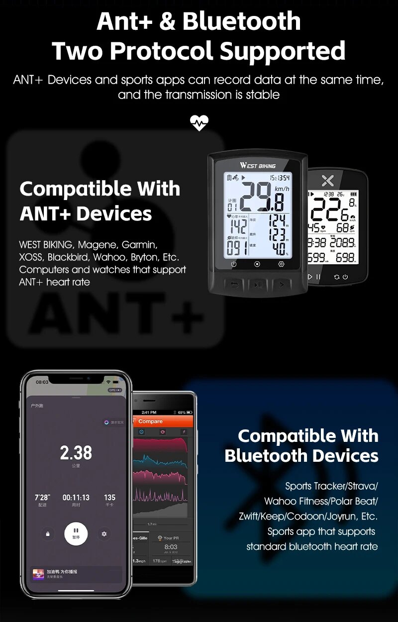 WEST BIKING спортивный пульсометр ANT + Bluetooth двойной режим Велоспорт Бег датчик пульса IP67 водонепроницаемый нагрудный ремень