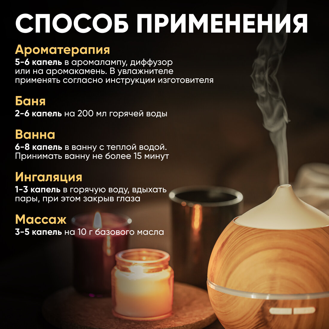 | Способ применения | Аромалампы: Взболтать флакон и добавить 3-5 капель в аромалампу или аромадиффузер. Бани: Взболтать флакон и добавить 3-5 капель в ковш с водой, этой смесью окропить камни, стены и лавки бани. |