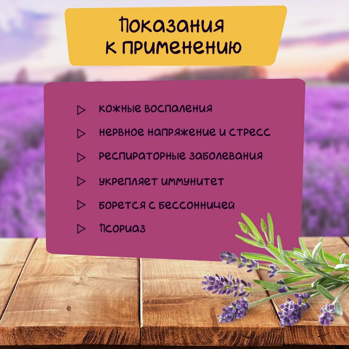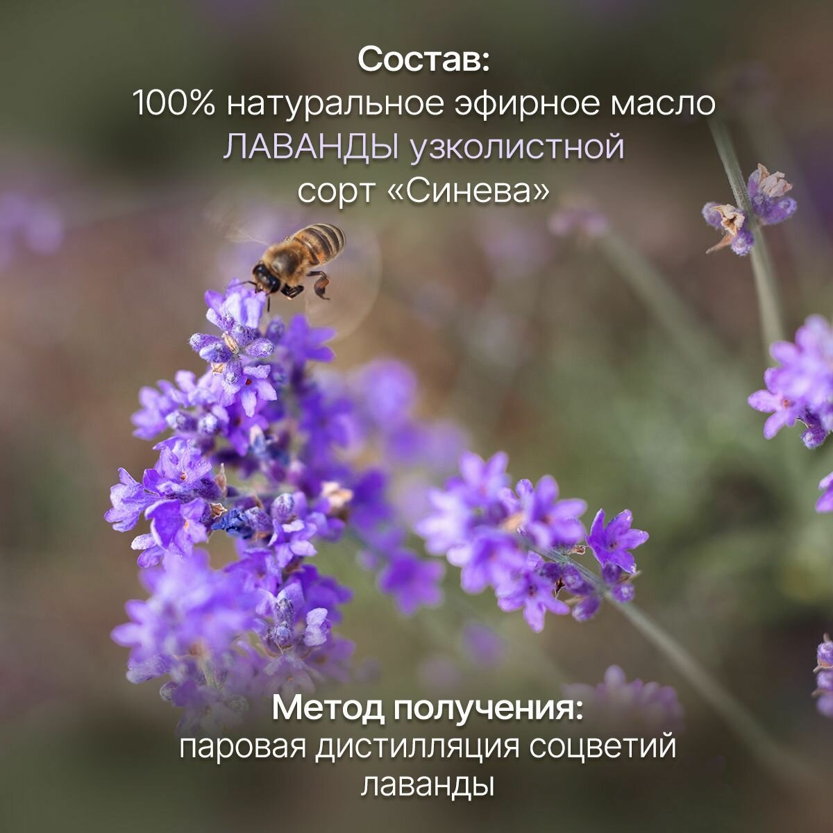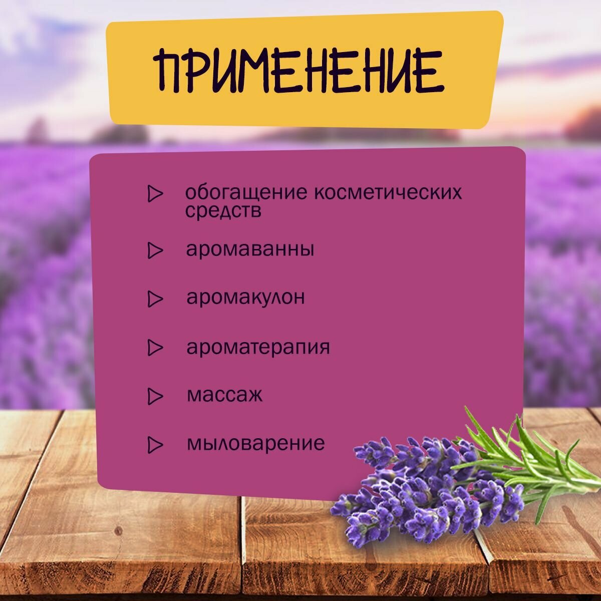 | Способ применения | На 100 мл базового масла (масло абрикосовых косточек, масло персиковых косточек, масло сладкого миндаля, масла жожоба или любого другого) необходимо добавить 15-20 капель эфирного масла лаванды. Эфирное масло лаванды может применяться для ухода за любым типом кожи. Это прекрасное средство при угревой сыпи, т.к. оно прекрасно снимает воспаления. Кроме того, эфирное масло лаванды способствует заживлению ран и повреждений, восстанавливает кожный покров, избавляет от угревых шрамов, очищает кожу от токсинов. Лавандовое масло является отличным антиоксидантом. Для ароматизации воздуха в помещениях и борьбы с молью достаточно капнуть несколько капель эфирного масла лаванды на кусочек ткани и поместить в шкаф. Для ароматизации воздуха применять в аромалампе из расчета 5-7 капель на 10 м² помещения. |