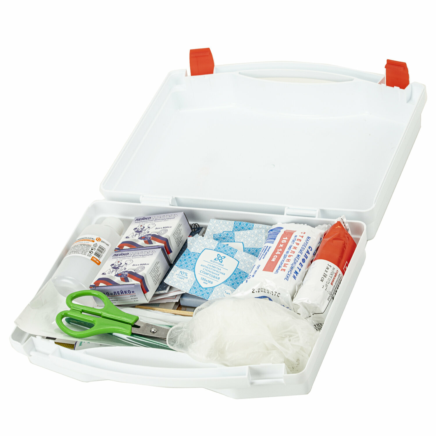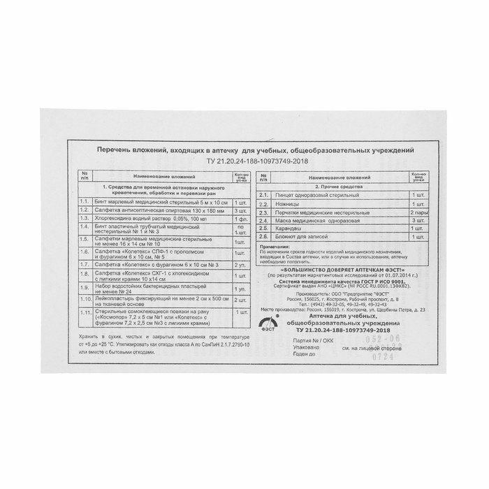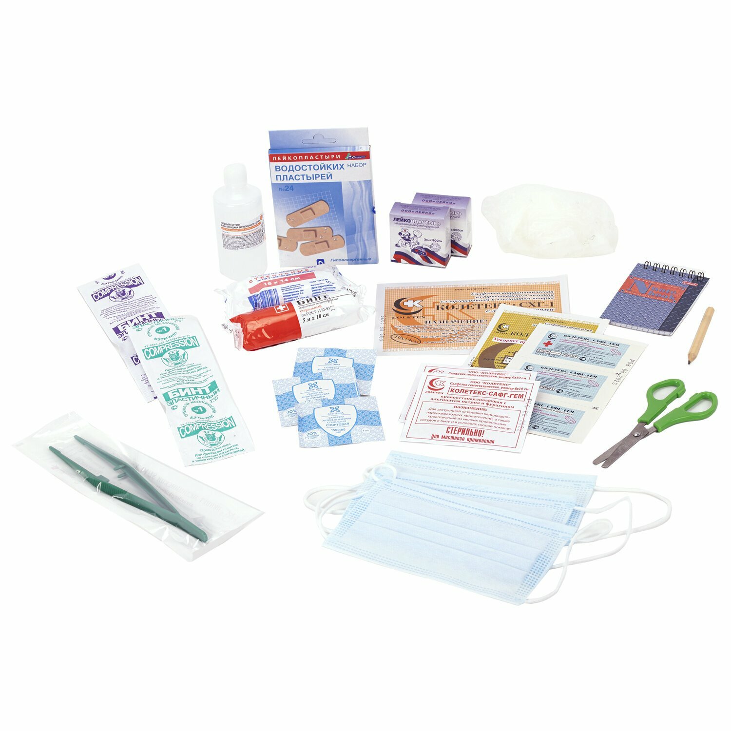 | Состав | хлоргексидина водный раствор 0,05%, 100 мл 1 фл., салфетка спиртовая антисептическая, не менее 125 х 110 мм 3 шт., пластырь фиксирующий 2 х 500 см, (на тканевой основе) 2 шт., набор водостойких бактерицидных пластырей №24 1 уп., стерильные самоклеющиеся повязки на рану («Космопор» 7,2 х 5 см №1 или «Колетекс» с фурагином 7,2 х 2,5 см №3 с липкими краями) 1 уп., салфетка «Колетекс» СПФ-1 с прополисом и фурагином 6 х 10 см, №5 1 шт., салфетка «Колетекс» СХГ-1 с хлоргексидином с липкими краями 10 х 14 см 1 шт., бинт марлевый медицинский стерильный 5 м х 10 см 1 шт., салфетка «Колетекс» с фурагином 6 х 10 см, №3 2 шт., салфетки марлевые медицинские стерильные 16 х 14 см, №10 1 шт., бинт эластичный трубчатый медицинский нестерильный № 1 и № 3 по 1 шт., пинцет одноразовый стерильный 1 шт., ножницы 1 шт., перчатки медицинские нестерильные 2 пары, маска медицинская одноразовая 3 шт., карандаш 1 шт., блокнот для записей 1 шт. |