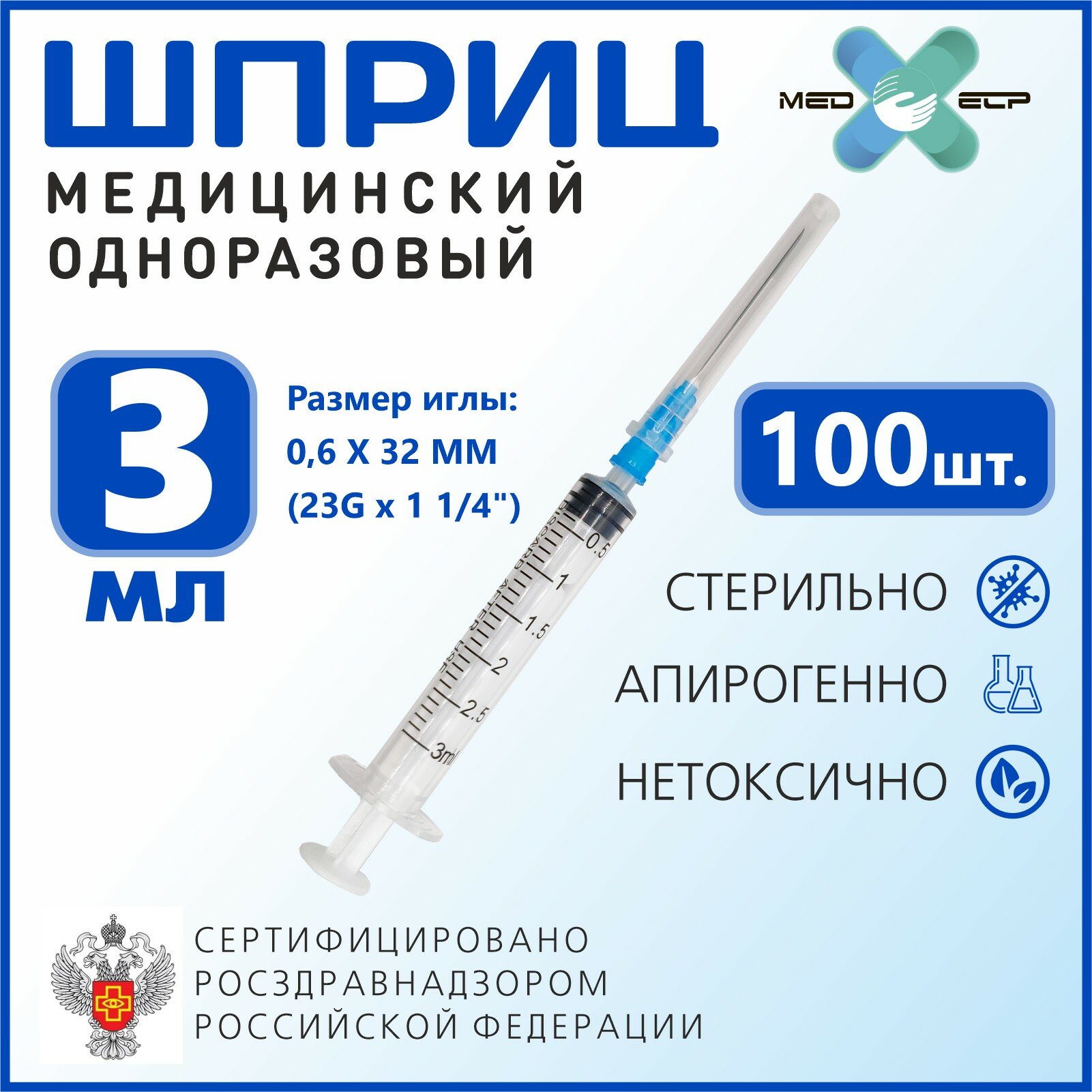 Шприц Med еlp 3мл с иглой G23 (0.6*32 мм) 100 штук 3-ех комп одноразовый стерильный интересное: