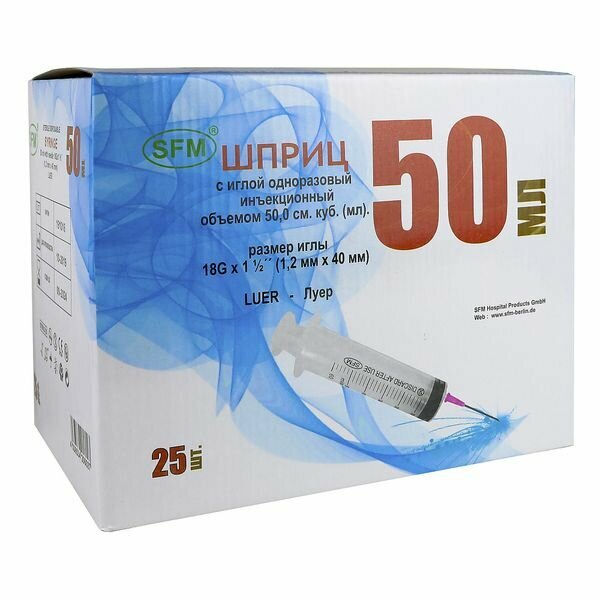 Шприц 50 мл трехкомпонентный, медицинский, для инъекций и уколов, с иглой крепление луер 1,2 x 40 - 18G, SFM Hospital Products GmbH, Германия, 25 штук