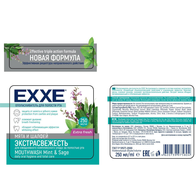 EXXE ополаскиватель Экстра свежесть мята и шалфей, 250 мл, шалфей