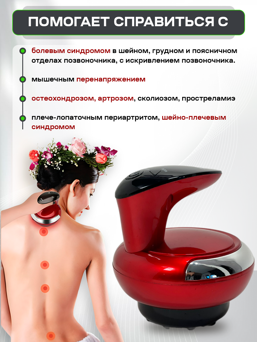 | Зона массажа | бедра / голени / живот / колени / ладони / лодыжки / локти / ноги / плечи / поясница / пресс / пятки / руки / спина / стопы / талия / тело / шея / ягодицы |