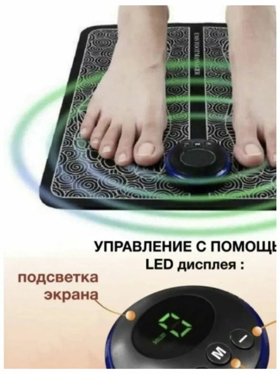 | Дополнительная информация | Расстелить массажный коврик, следом подсоединить к нему на кнопки миостимулятор ( в комплекте), далее нужно встать на массажный коврик по разметке и включить нужную для вас программу. Включить - нажать на леваую кнопу "+". Выбор программы: кнопка по сренедине - "М". После выбора программы нажмите еще раз нажмите на кнопку "+" и установите требуемую мощность. Чтобы выключить массажёр нужно нажимать на кнопку "-". Если массажёр не заработал сразу, значит скорее всего его нужно зарядить около 30 минут. |