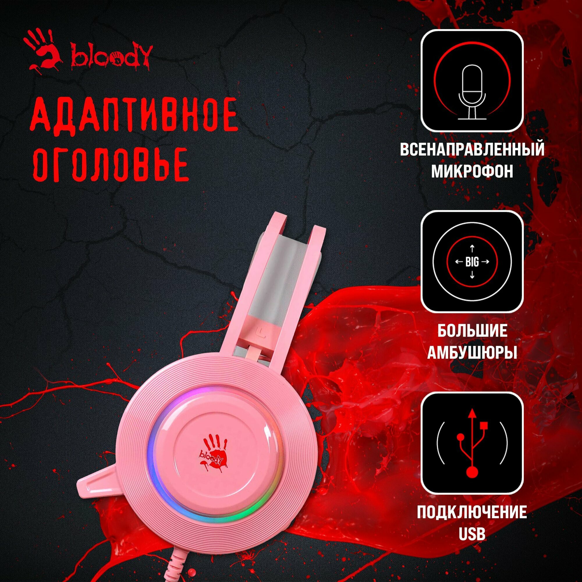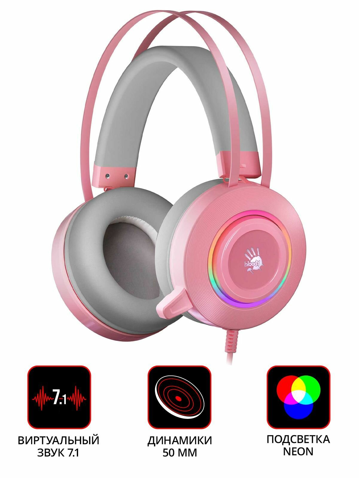 Купить Игровые наушники с микрофоном A4Tech Bloody G521 розовый 2.3м мониторные, подсветка, USB, игровая гарнитура, виртуальный звук 7.1