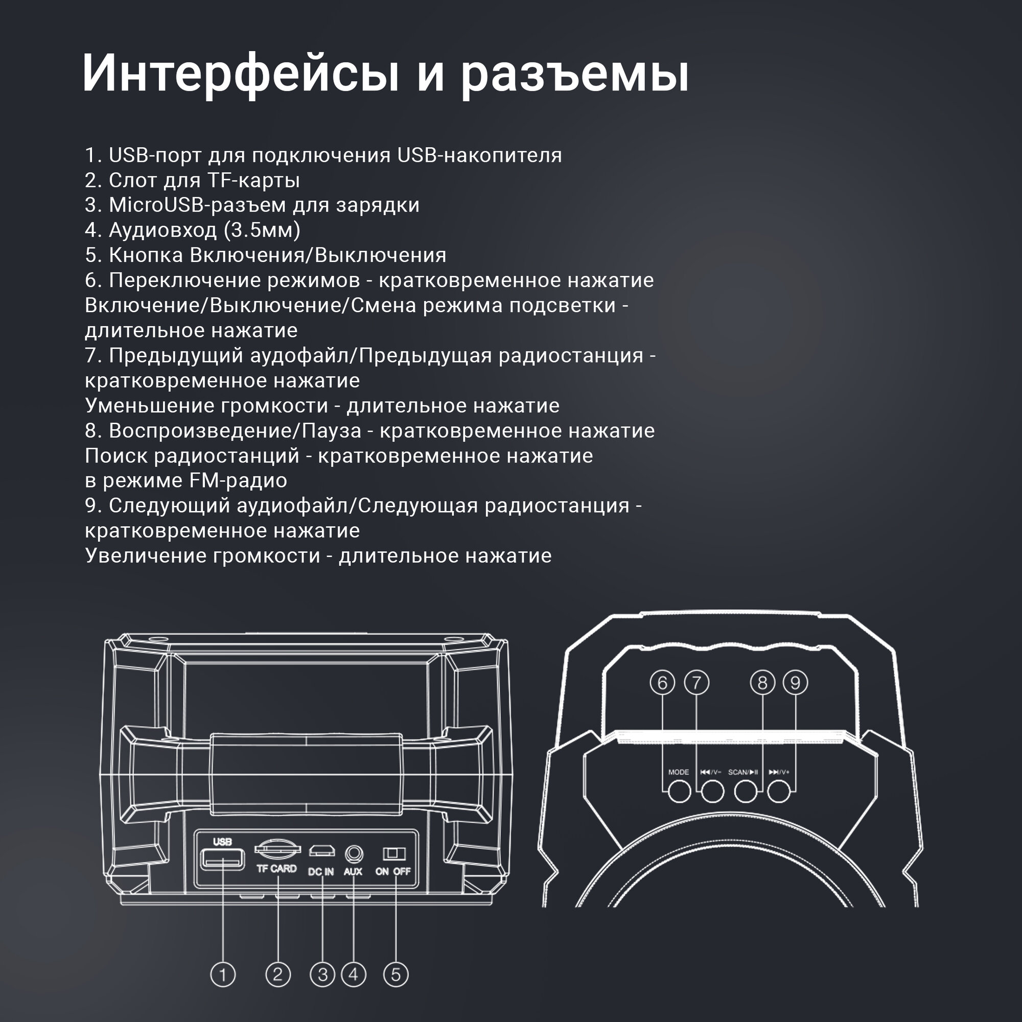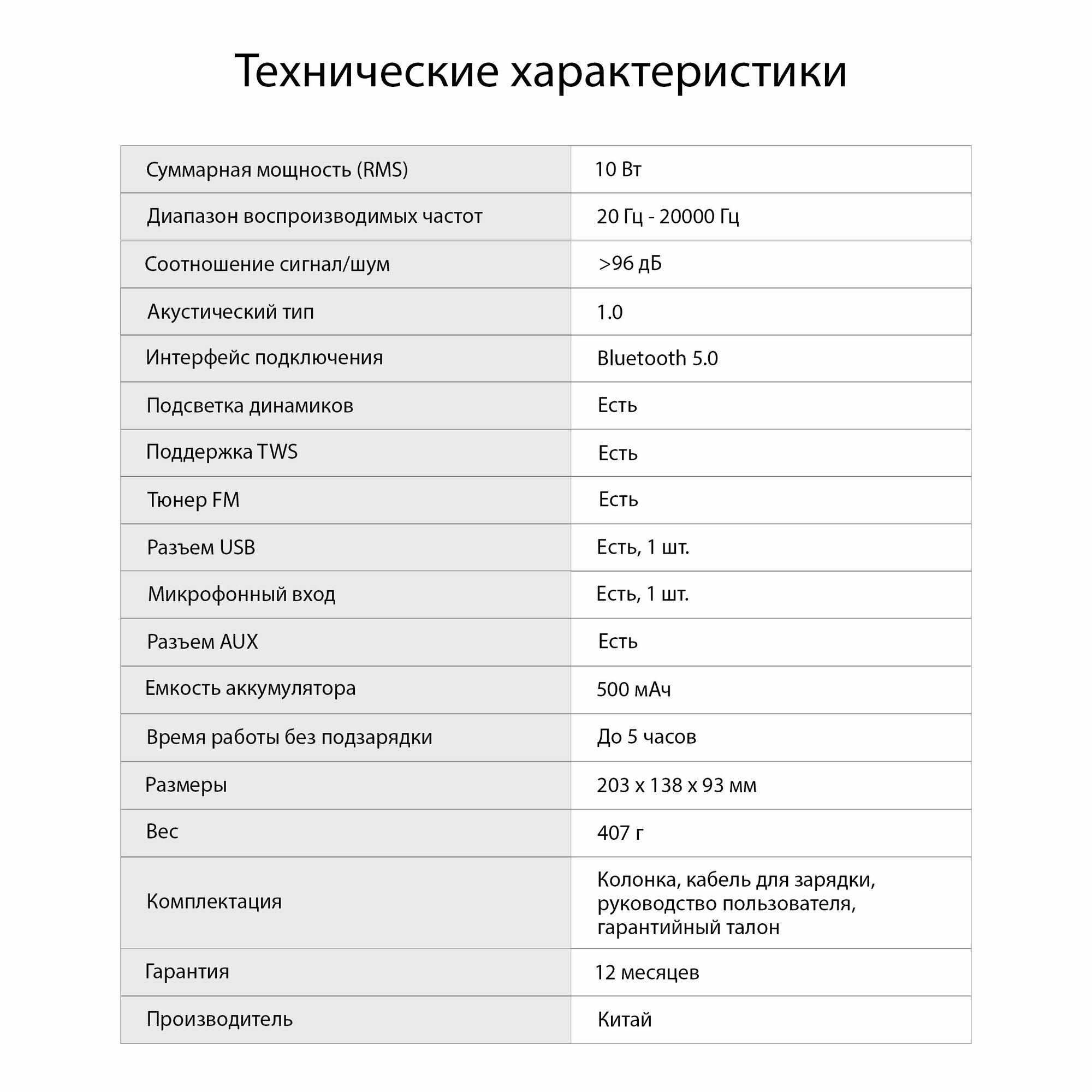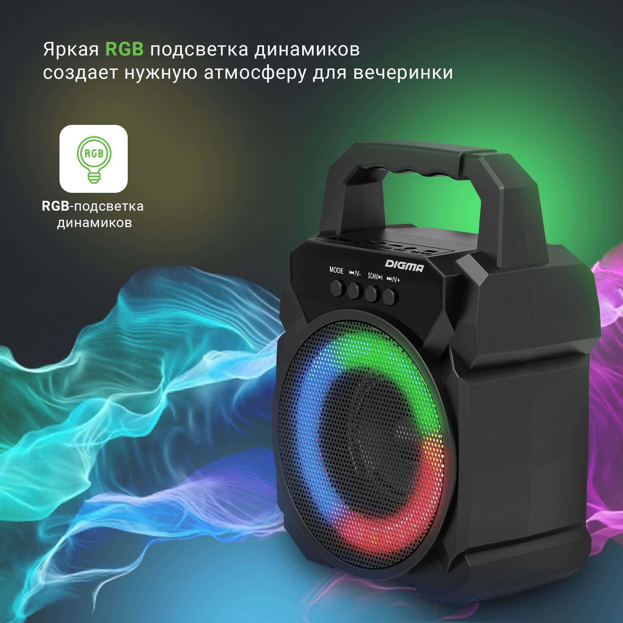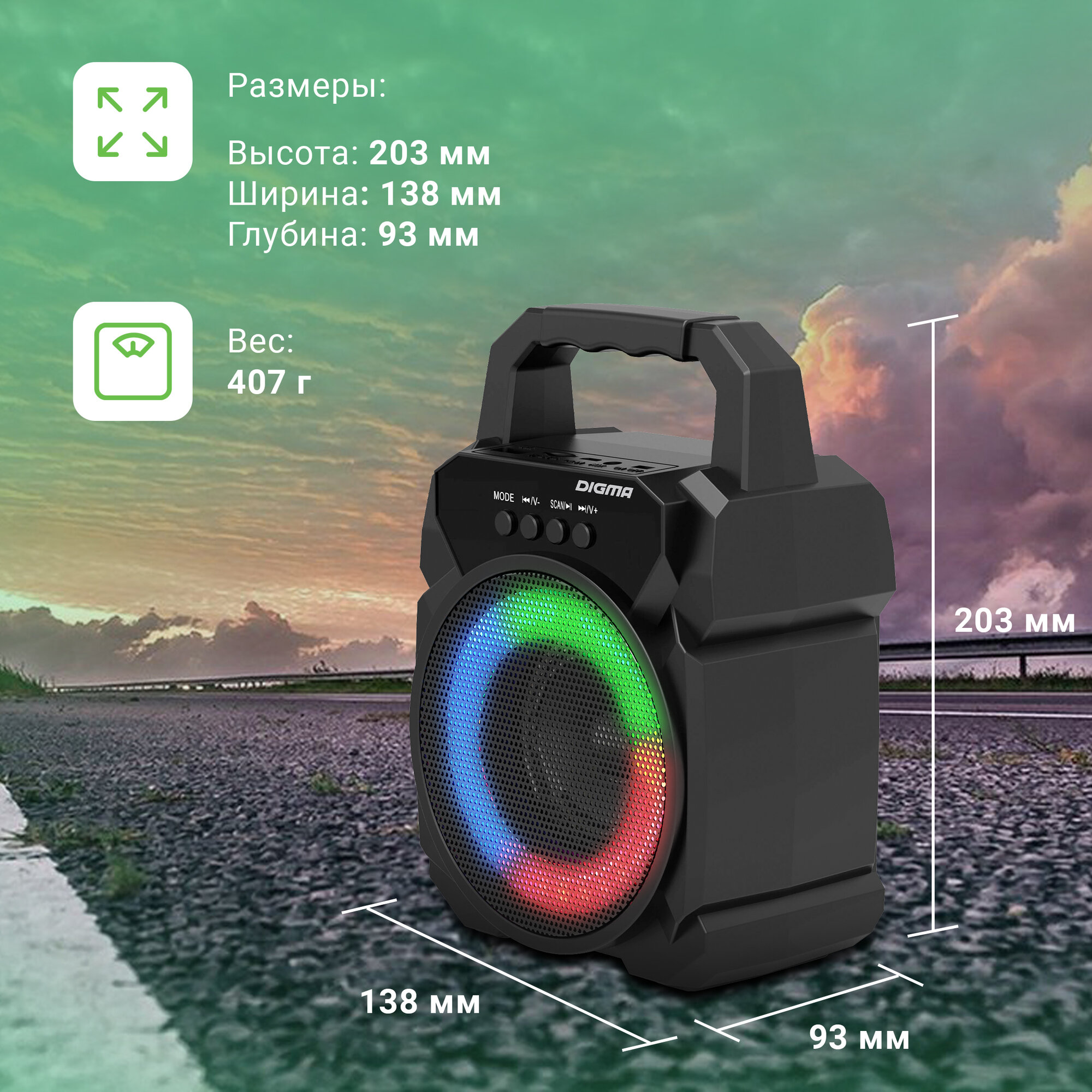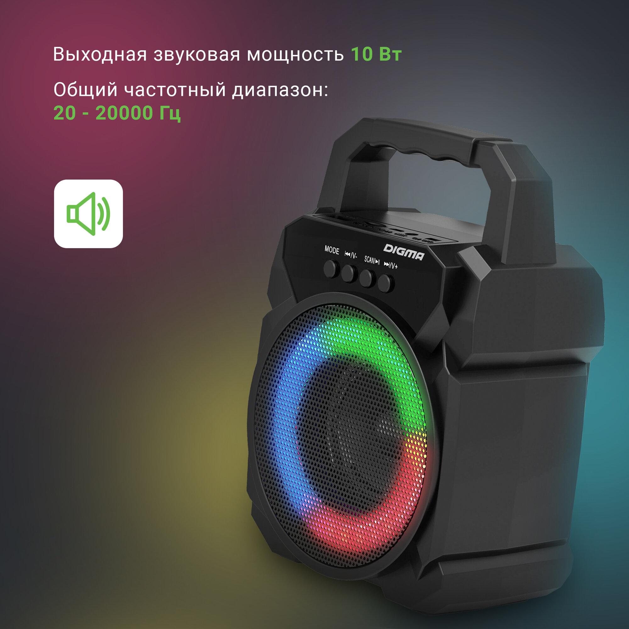 | Особенности | FM-радио / поддержка microSD / ручка / световые эффекты |