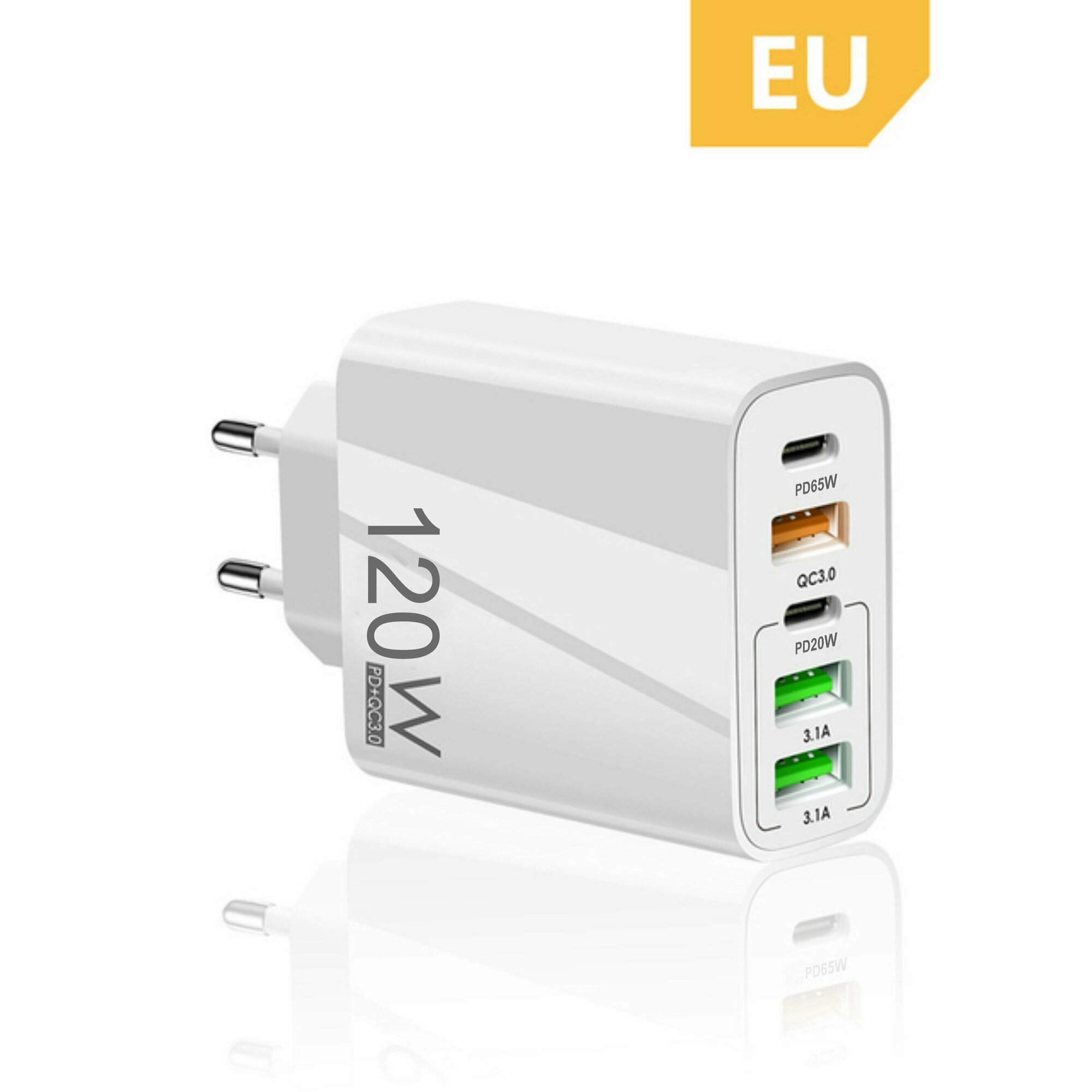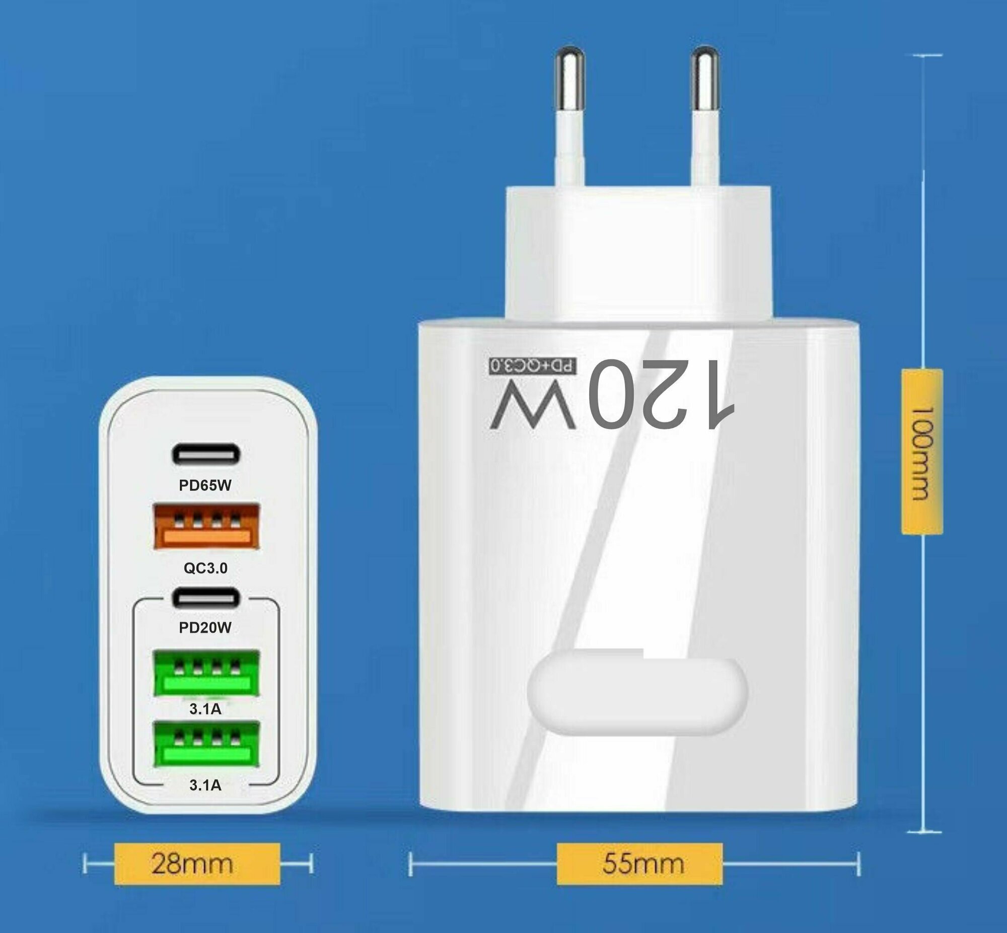 Пятипортовая быстрая зарядка 120W. Сетевое зарядное устройство QUALCOMM 3.0(55АС) 2023 Новинка. PD+QC3.0. 3*USB и 2*Type C. Без кабеля. Цвет белый