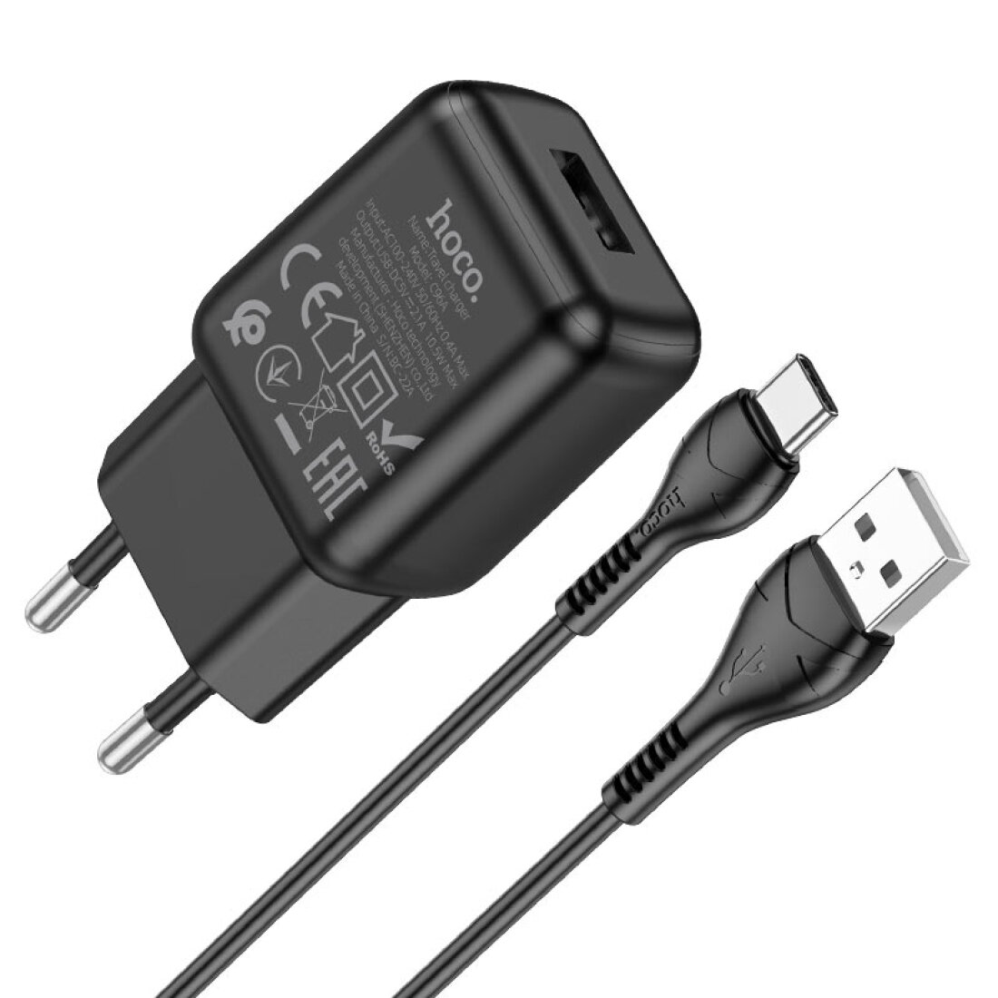 Сетевое зарядное устройство Hoco C96A, 1 USB, 2.1 А, кабель Type-C-USB, 1 м, чёрное