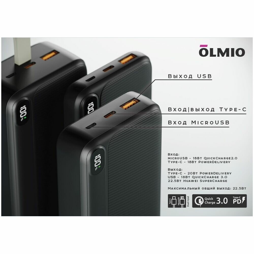 Внешний аккумулятор Olmio L-20 22.5W 20000 mAh "быстрая зарядка" черный интересное: