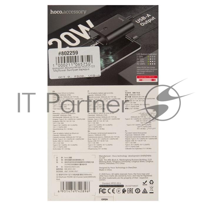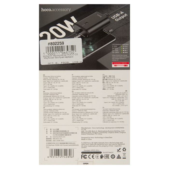 Внешний АКБ HOCO Q3 Mayflower 10000 mAh, 1xUSB, 1xUSB-C, 3А, QC3.0, PD20W, LED, Li-Pol (черный)
