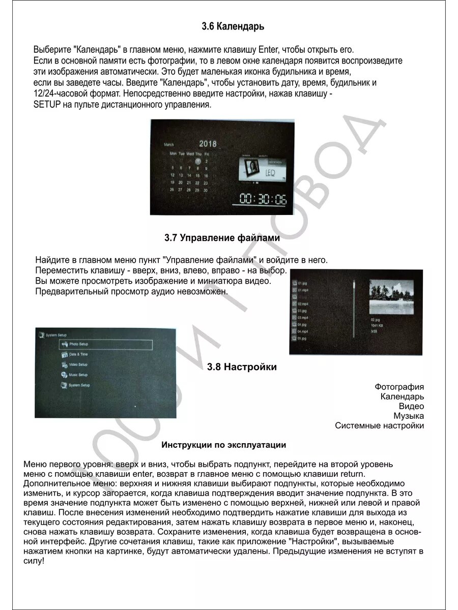 | Особенности | будильник, встроенный динамик, календарь, настенное крепление, проигрывание видео, пульт ДУ, с часами |