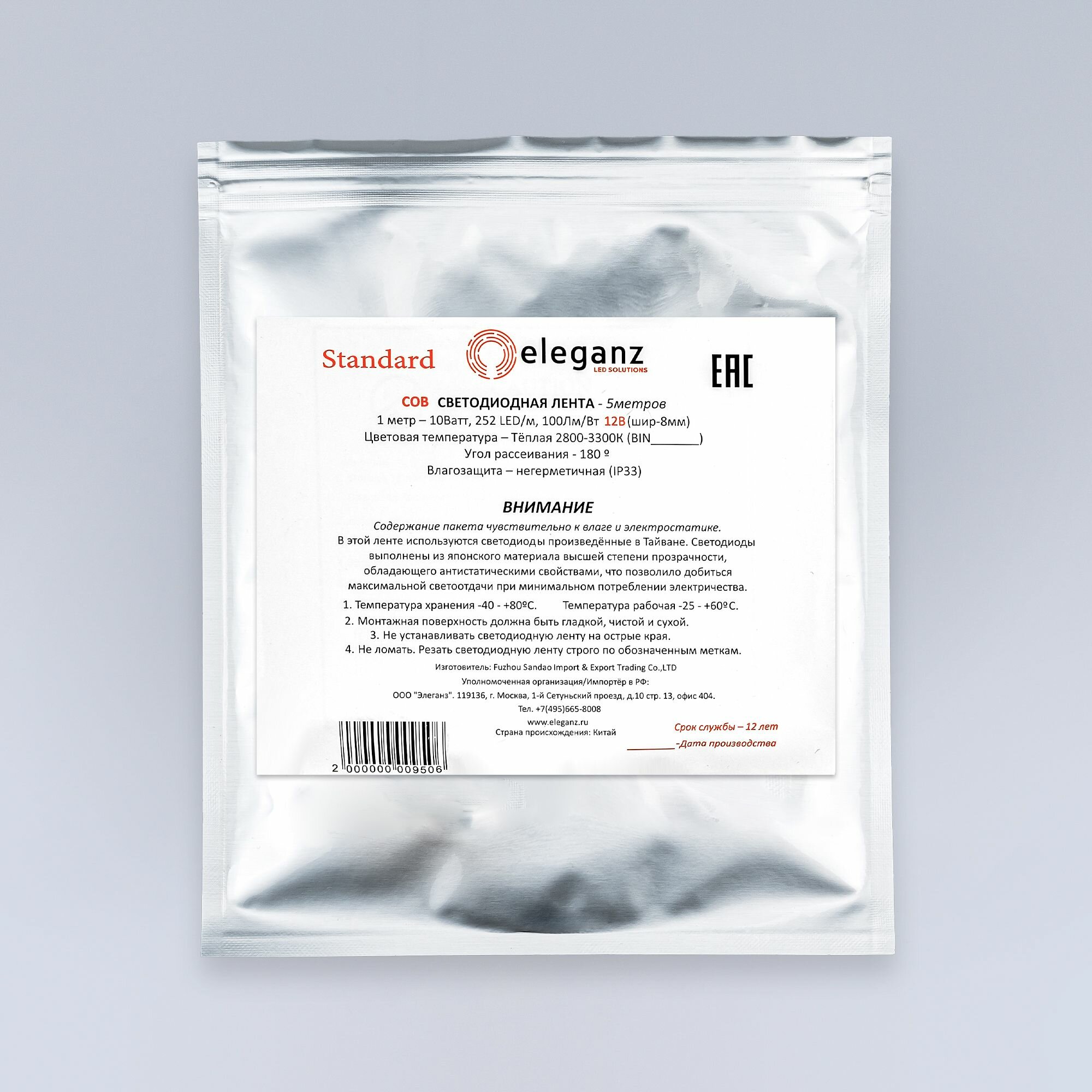 | Комплектация | Светодиодная СОВ гибкая лента Standart "Eleganz 12V" 10 Вт , 252 LED, IP33 Теплый белый свет, 5м. - 1шт. с проводами с двух сторон |