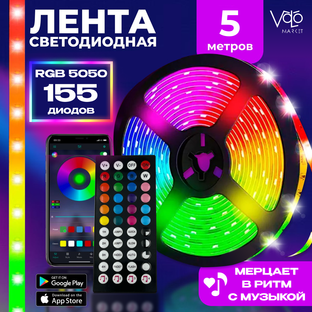 Купить Светодиодная лента RGB Bluetooth с пультом управления многоцветная, гирлянда, подсветка, 5 метров/ диоды 5050