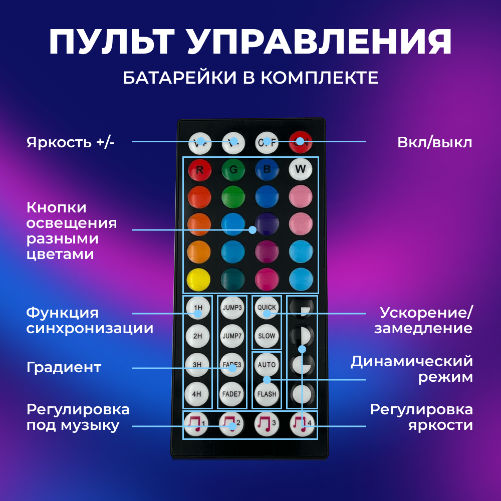 | Особенности | RGB-контроллер в комплекте / режим ночника / самоклеящаяся основа |