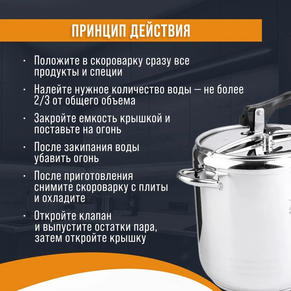 | Дополнительная информация | капсульное дно; оснащена клапаном контроля давления и клапаном избыточного давления; максмальное рабочее давление 55 кПа; ручки на заклепках; зеркальная полировка |